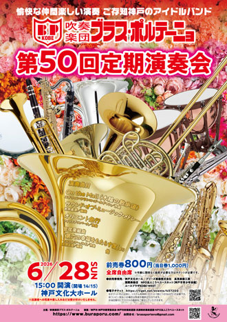 | 2026年6月28日(日) 神戸文化大ホール 開演 15:00(開場 14:15) 前売券 800円(当日券1,000円)全席自由席 WEBでのご購入はTIGETで! https://tiget.net/events/457200 ★TIGETチケットについて ※チケット代とは別にシステム利用料(チケット1枚につき363円)が必要です。※コンビニ支払いの場合は別途手数料がかかります。 ※当日受付にてスマホの画面をご提示していただきます。 演奏曲目 On the Mall(エドウィン・フランコ・ゴールドマン/作曲) サウンド・オブ・ミュージック・メドレー(岩井直溥/編曲) たオリエント急行(フィリップ・スパーク/作曲) 管弦楽組曲「第六の幸福をもたらす宿」より (マルコム・アーノルド/作曲 天野正道/編曲) 他 ●前売券発売/神戸文化ホール ブリーズ楽器株式会社 高見楽器工房 国際楽器店 NPO法人こうべユースネット(神戸市青少年会館5階) ユースプラザKOBE・WEST ■演奏会の注意事項■ ◆出演者への花束や差し入れなどは受け付けいたしません。 ◆前売券完売の際は当日券はございません。 ◆年齢に関係なく座席が必要な方はチケットが必要です。 ◆開場前は混雑が予想されます。時間に余裕をもってお越しください。 |