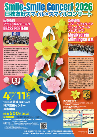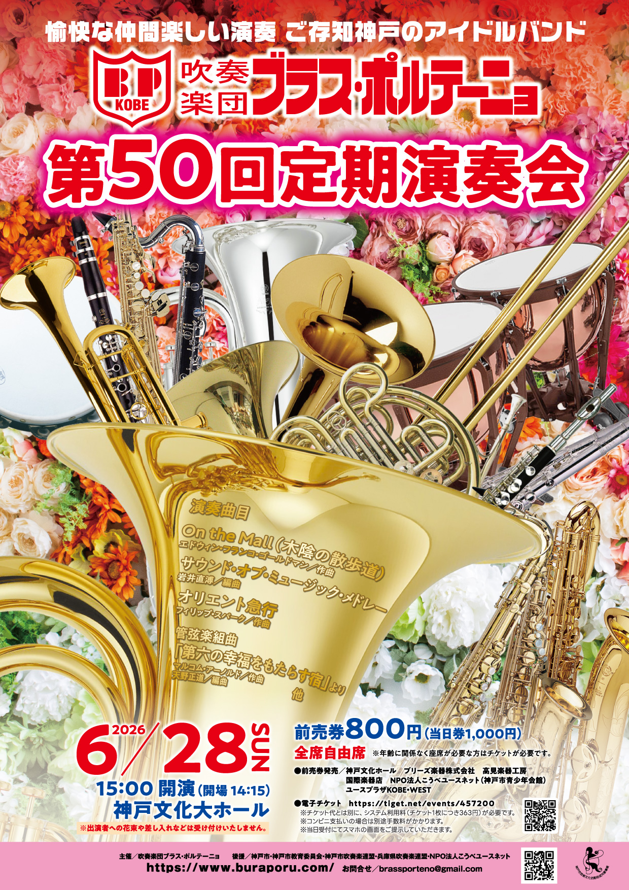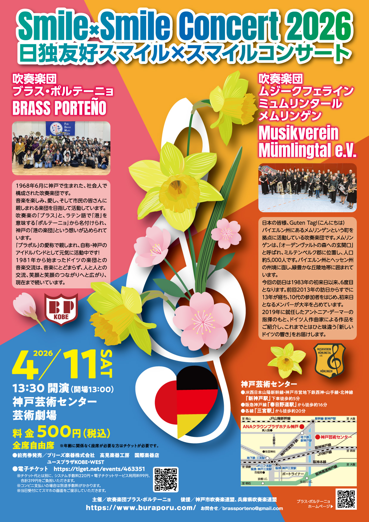 | 2026年4月11日(土) 神戸芸術センター芸術劇場 開演 13:30(開場 13:00) 入場料 500円(当日も同額)全席自由席 WEBでのご購入はTIGETで! https://tiget.net/events/463351 ★TIGETチケットについて ※チケット代とは別にシステム利用料(チケット1枚につき363円)が必要です。※コンビニ支払いの場合は別途手数料がかかります。 ※当日受付にてスマホの画面をご提示していただきます。 出演/ 吹奏楽団ブラス・ポルテーニョ ムジークフェライン ミュムリンタール メムリンゲン ブラポルと交流のあるドイツの楽団の来日記念合同コンサートです。 合同演奏もあります。 ●前売券発売/ブリーズ楽器株式会社 高見楽器工房 国際楽器店 ユースプラザKOBE・WEST ■演奏会の注意事項■ ◆出演者への花束や差し入れなどは受け付けいたしません。 ◆前売券完売の際は当日券はございません。 ◆年齢に関係なく座席が必要な方はチケットが必要です。 ◆開場前は混雑が予想されます。時間に余裕をもってお越しください。 |